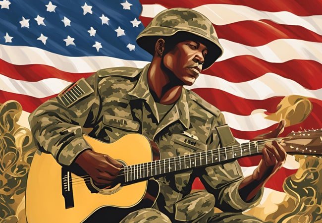 A U.S. Army veteran playing guitar with musical notes surrounding him, set against the backdrop of a waving American flag, symbolizing the healing power of music therapy for veterans with PTSD.